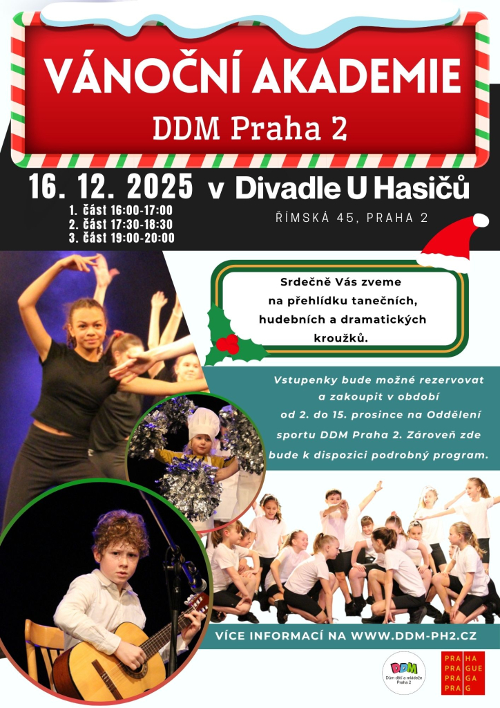 Přehlídka tanečních, hudebních a dramatických kroužků v Divadle U Hasičů. Vstupenky bude možné rezervovat a zakoupit v období od 2. do 15. prosince na oddělení sportu DDM Praha 2. Zároveň zde bude k dispozici podrobný program.